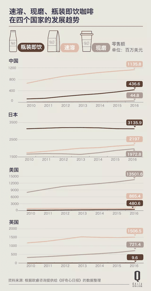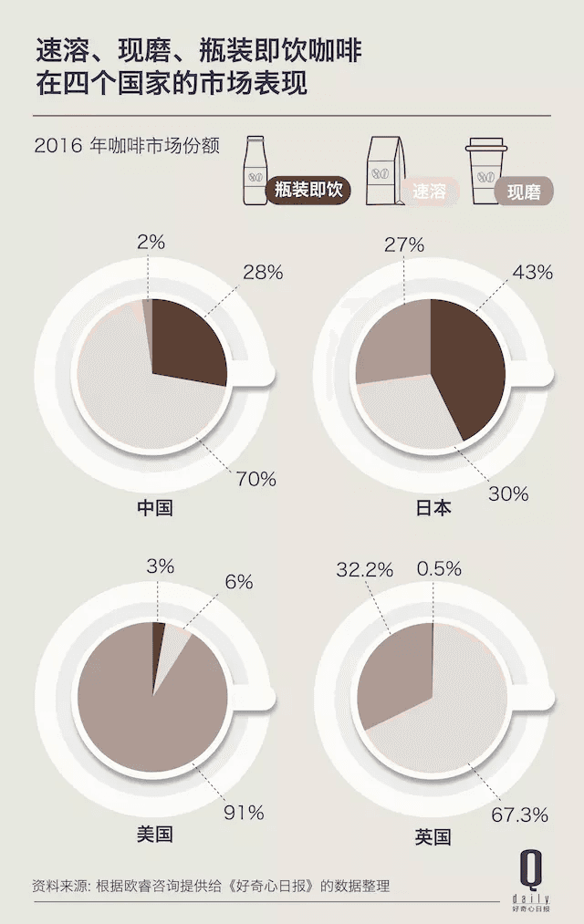 In China, instant coffee is still king, holding about 70% of the market. But growth has slowed—so much so that Nestlé destroyed 400 tons of unsold instant coffee last year. The real action is happening elsewhere: bottled ready-to-drink (RTD) coffee is exploding, growing 21% in 2016 alone and expected to hit $850 million by 2020. Meanwhile, freshly brewed coffee—though tiny at just 2% of the market—is expanding at lightning speed, over 20% growth per year. No wonder Starbucks and Costa are racing to open more stores.
