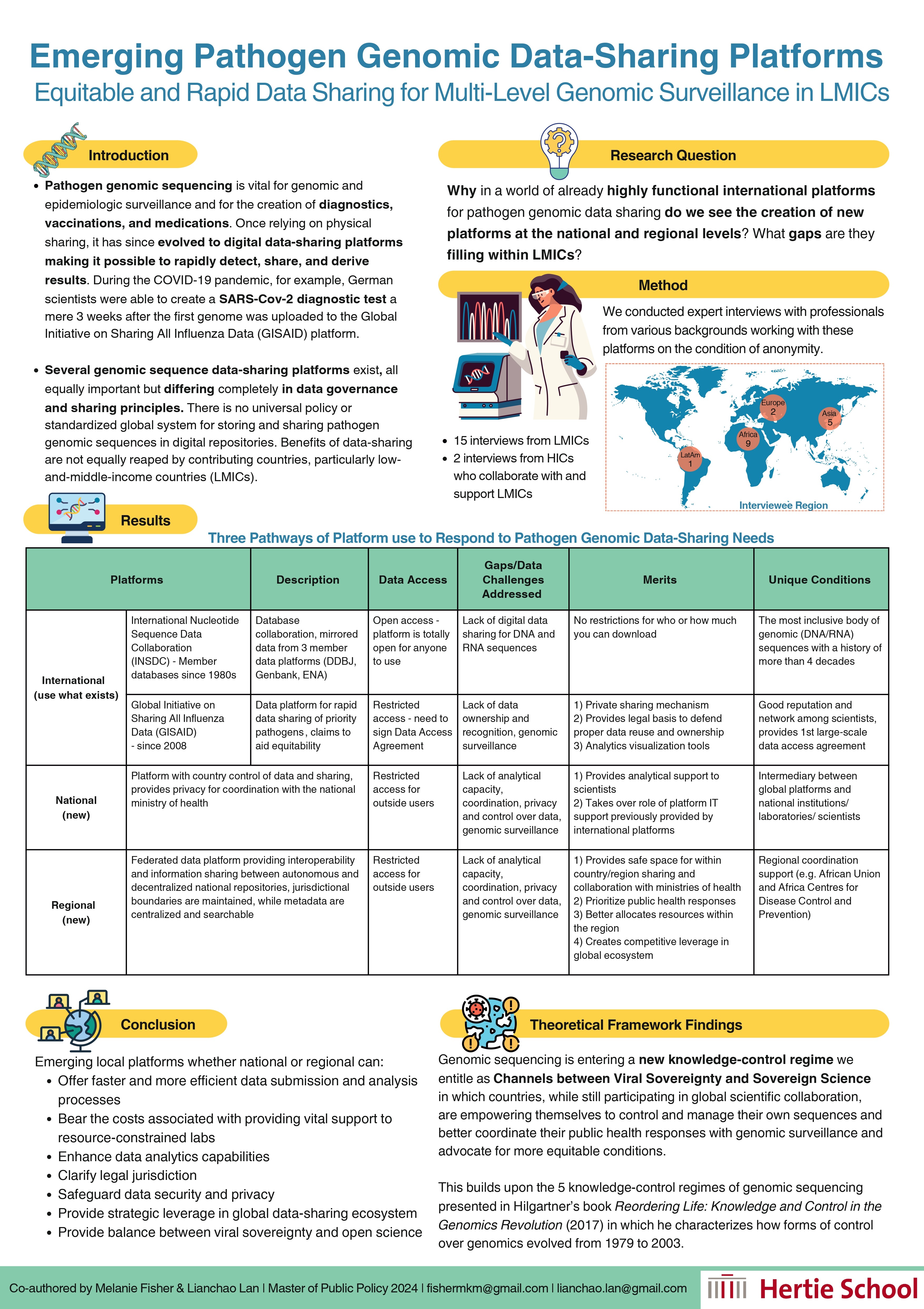 The study draws on the theoretical framework of knowledge-control regimes to understand how “viral sovereignty” and “sovereign science” influence the development of LMIC platforms. Interview data with LMIC experts with experience in data sharing is synthesized in the present study to describe models of data platforms that could ensure effective public health responses and equitable, transparent data sharing. Additionally, the study highlights the contributions of emerging pathogen genomic initiatives across various regions such as Africa and Asia Pathogen Genomic Initiatives (PGIs) to genomic surveillance, while also noting significant communication and coordination challenges.